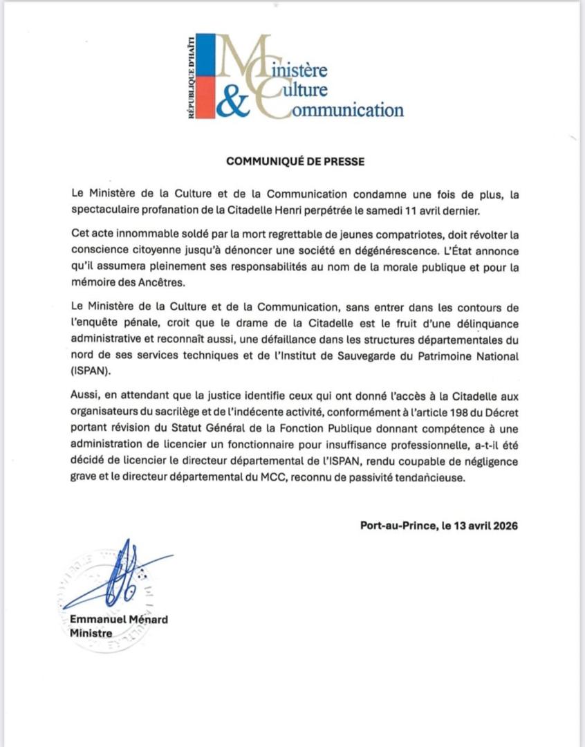 PASSATION DE POUVOIR AU MINISTÈRE DE LA CULTURE : EMMANUEL MÉNARD VEUT HISSER HAÏTI AU RANG DE « PUISSANCE CULTURELLE »