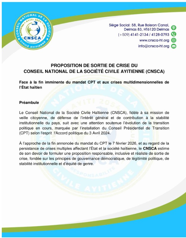 Port-au-Prince, Mardi 5 janvier 2025 – À quelques semaines de l’échéance constitutionnelle du 7 février 2026, marquant la fin du mandat du Conseil présidentiel de transition (CPT), la perspective d’un vide institutionnel suscite de vives inquiétudes en Haïti. Dans ce contexte jugé critique, le Conseil national de la société civile Ayitienne (CNSCA) est monté au créneau en publiant, ce mardi, une prise de position appelant à une « sortie de crise responsable, inclusive et réaliste ».